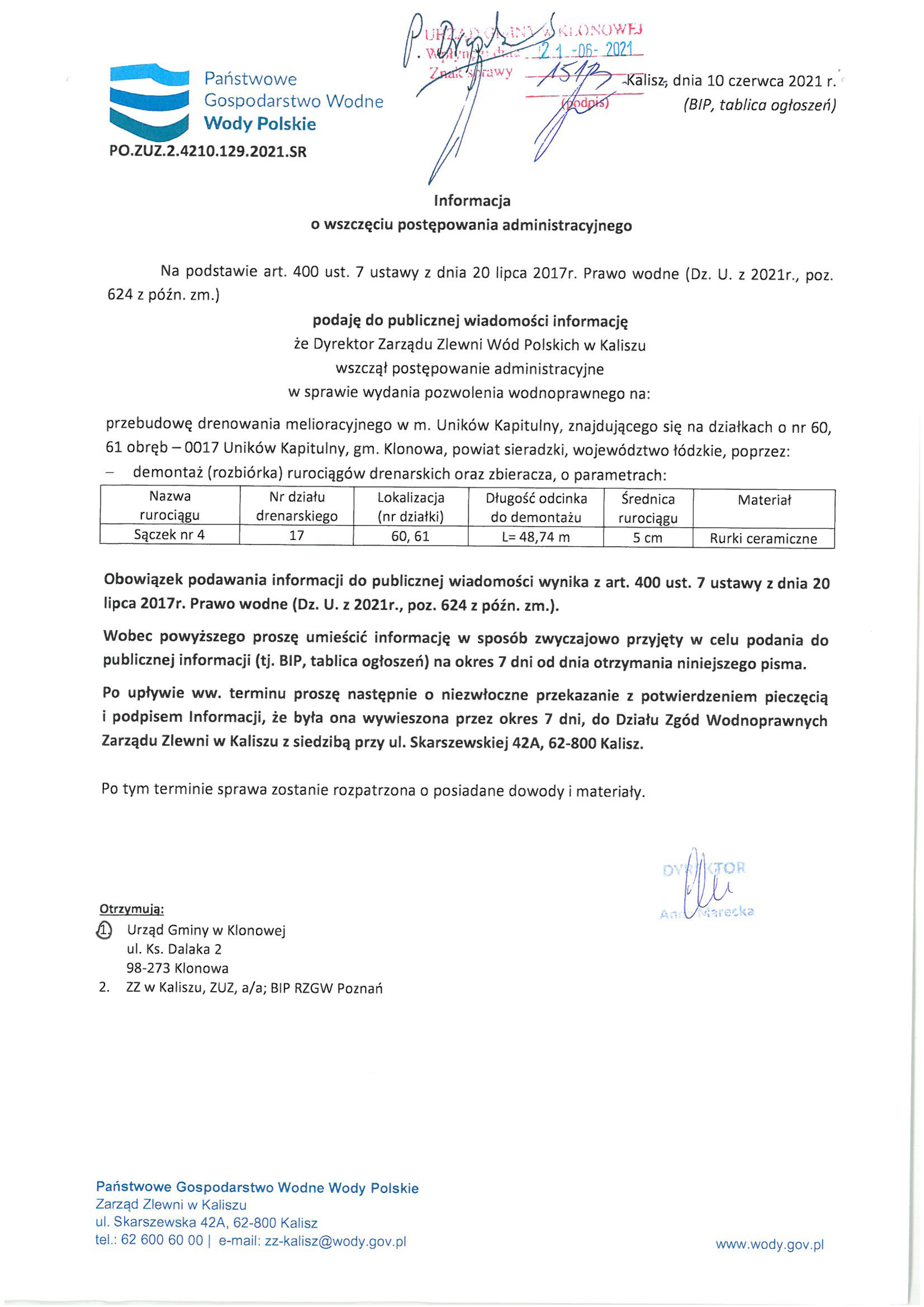 Ogłoszenie o wyborze oferty w związku z udzieleniem pomocy finansowej w 2020 r. w formie dotacji z budżetu Gminy Klonowa z zakresu Prawa Wodnego