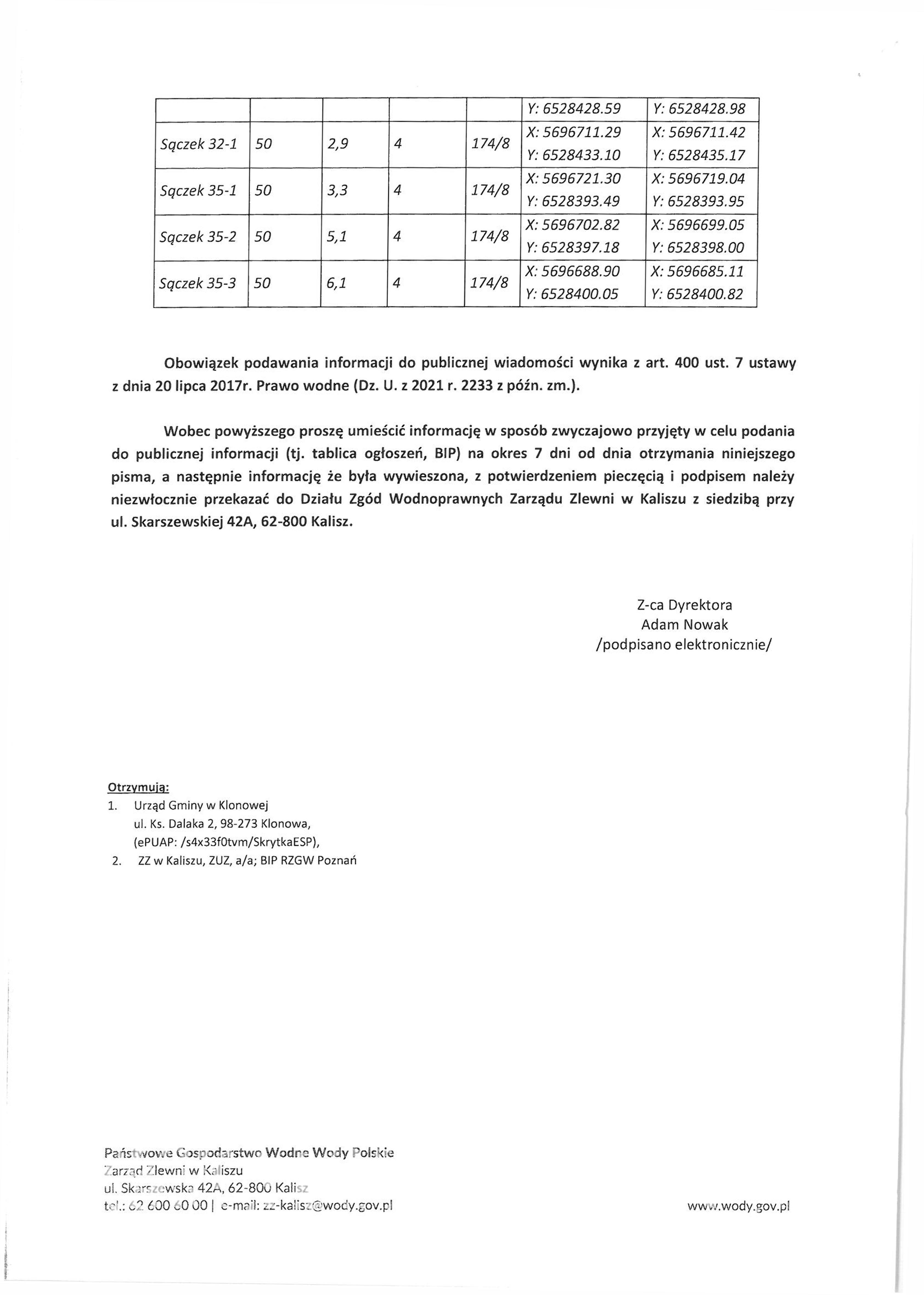 Wobec powyższego proszę umieścić informację w sposób zwyczajowo przyjęty w celu podania do publicznej informacji (tj. tablica ogłoszeń, BIP) na okres 7 dni od dnia otrzymania niniejszego pisma, a następnie informację, że była wywieszona, z potwierdzeniem pieczęcią i podpisem należy niezwłocznie przekazać do Działu Zgód Wodnoprawnych Zarządu Zlewni w Kaliszu z siedzibą przy ul. Skarszewskiej 42A, 62-800 Kalisz.