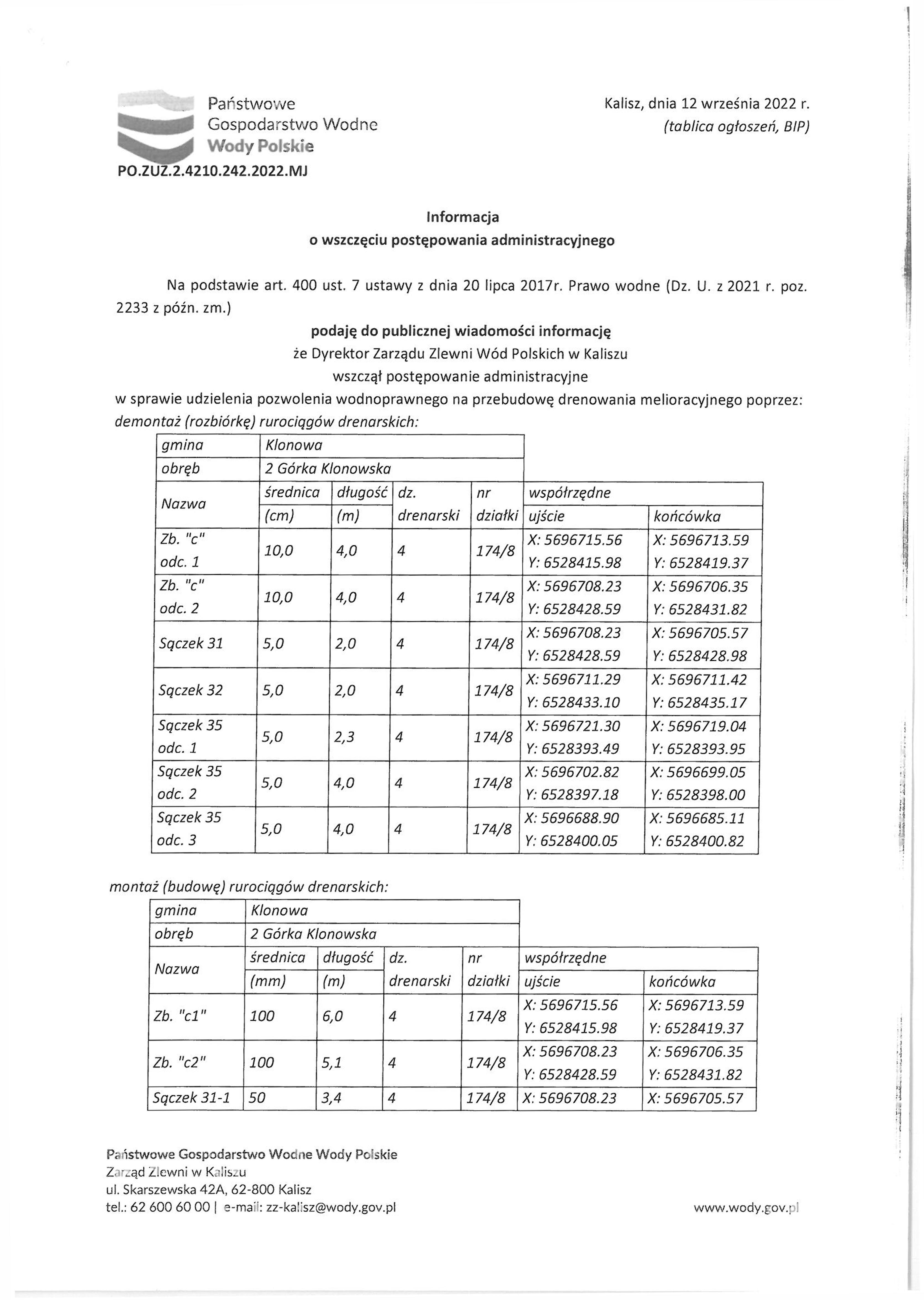 Na podstawie art. 400 ust. 7 ustawy z dnia 20 lipca 2017r. Prawo wodne (Dz. U. z 2021 r. poz. 2233 z późn. zm.) podaję do publicznej wiadomości informację że Dyrektor Zarządu Zlewni Wód Polskich w Kaliszu wszczął postępowanie administracyjne w sprawie udzielenia pozwolenia wodnoprawnego na przebudowę drenowania melioracyjnego poprzez: demontaż (rozbiórkę) rurociągów drenarskich.