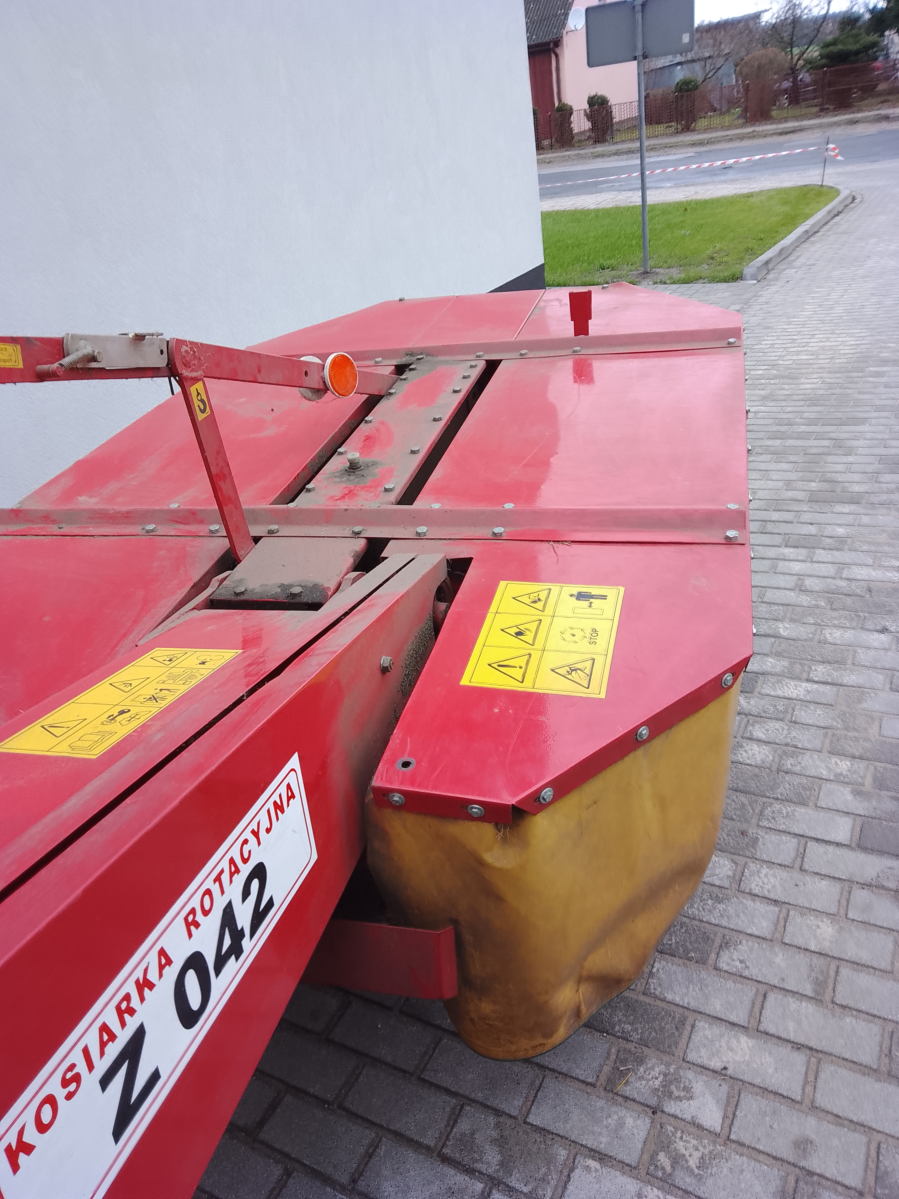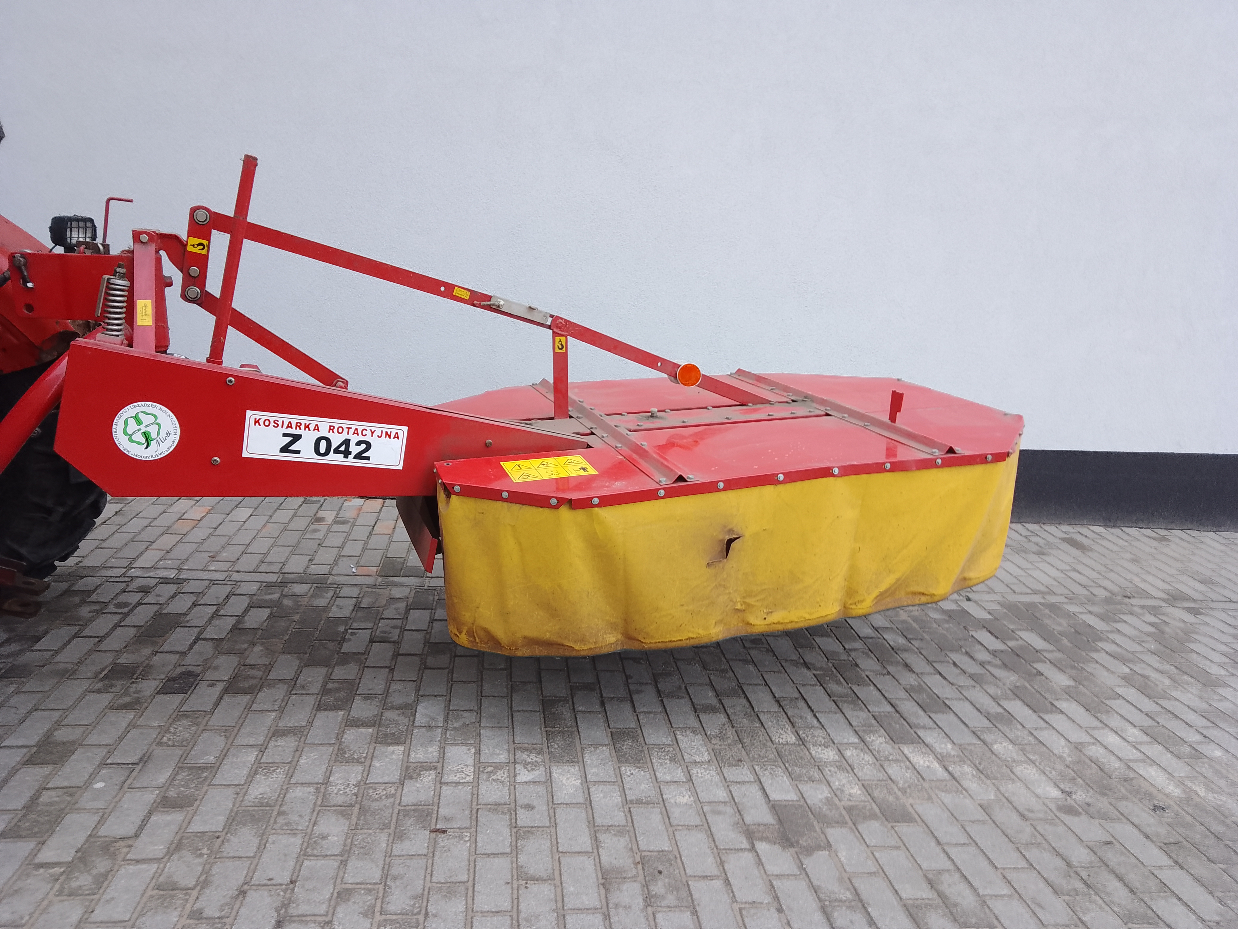 Kosiarka rotacyjna Z 042, wyprodukowana przez: Mechanika Maszyn i Urządzeń Rolniczych Zygmunt Miotk w styczniu 2009 r. Kosiarka zakupiona w kwietniu 2009 roku, szerokość robocza 165 cm, obroty WOM 540 obr/min, masa 360 kg, prędkość obrotowa bębnów roboczych 2070 obr/min, dwa bębny (3 noże na bęben). Używana sporadycznie, stan bardzo dobry.
